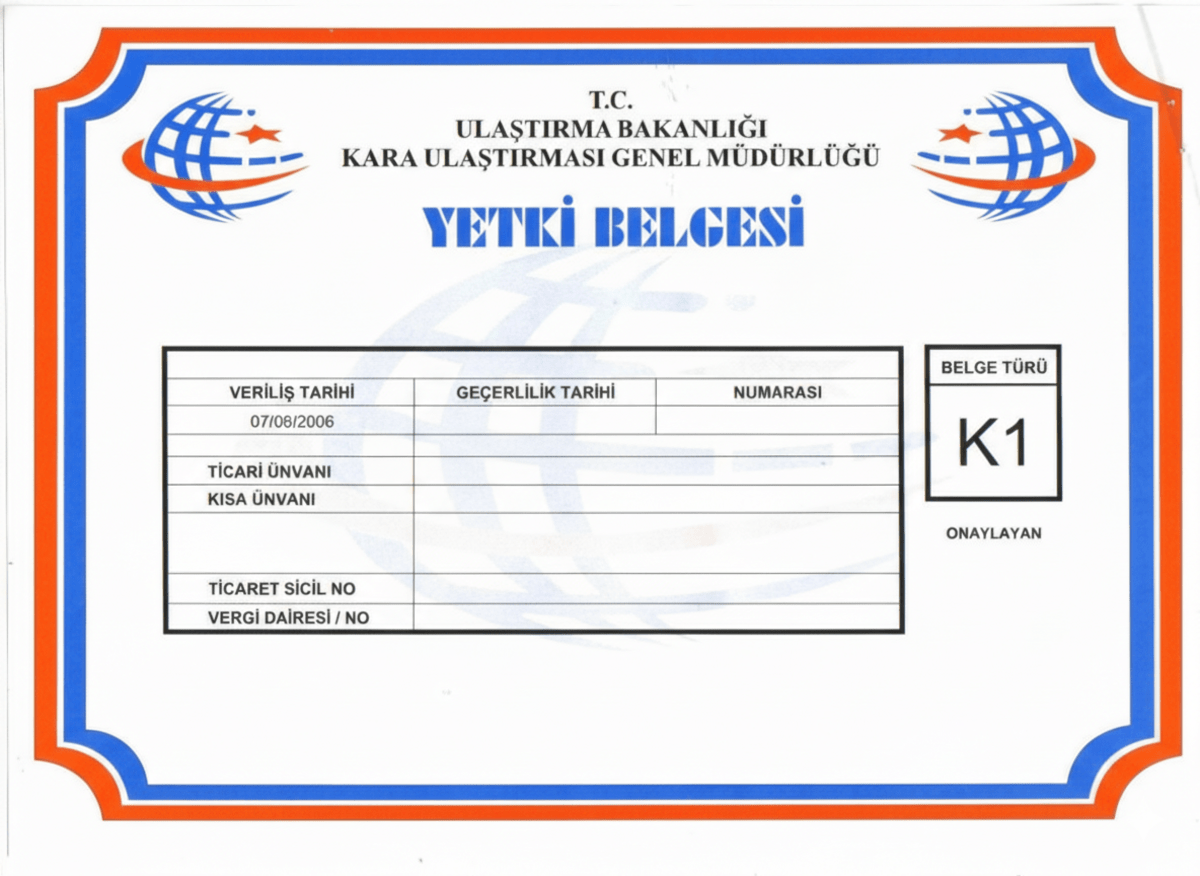 T.C. Ulaştırma Denizcilik ve Haberleşme Bakanlığı 8 Ocak 2018 tarihli ve 30295 sayılı Resmi Gazetede yayımlanan Yeni “KARAYOLU TAŞIMA YÖNETMELİĞİ” hükümlerince gerçek ve tüzel kişilerin faaliyet alanlarına uygun yetki belgelerini bulundurmaları zorunludur. Şehir içi ve Şehirler arası ticari yük taşıması yapacak olan Kamyonet/Kamyon/Tır gibi araçların K1/L1 belgesine sahip olması gereklidir.